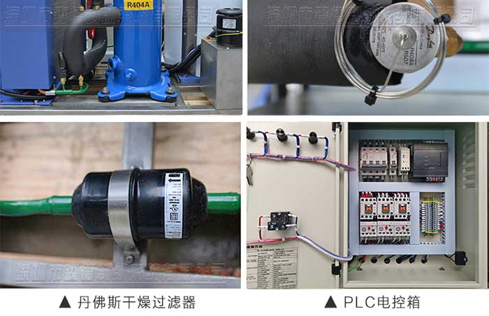 4.采用一線品牌制冷配件:德國比澤爾、丹麥丹佛斯、美國谷輪、臺灣漢鐘壓縮機、意大利萊富康等知名壓縮機,丹佛斯電磁閥、膨脹閥、干燥過濾器、美國愛默生膨脹閥等制冷配件,片冰機質(zhì)量可靠,故障率低,制冰效率高。
